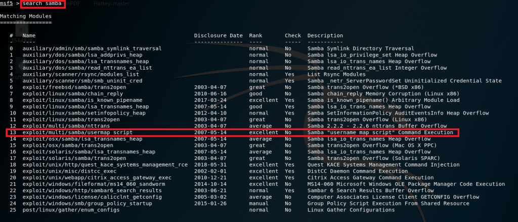 1 – Netbios-ssn servisinde çalışan Samba için Msfconsole üzerinde bir zafiyet arayalım.