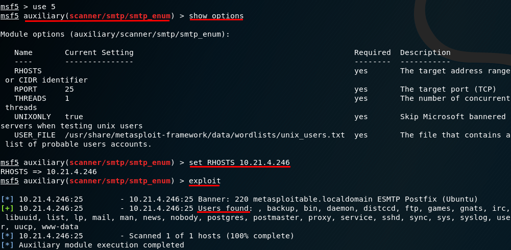 1 – SMTP sunucusunda olan geçerli kullanıcıları belirlememiz için kullanacağımız modül ; auxiliary/scanner/smtp/smtp_enum