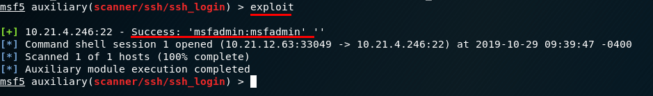 3 – Exploit ettiğimizde brute force atağı başlamış olacak. Kullanıcı adı ve şifresi msfadmin olan bir kullanıcı bulmuş olduk.