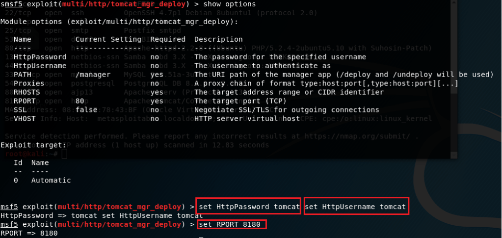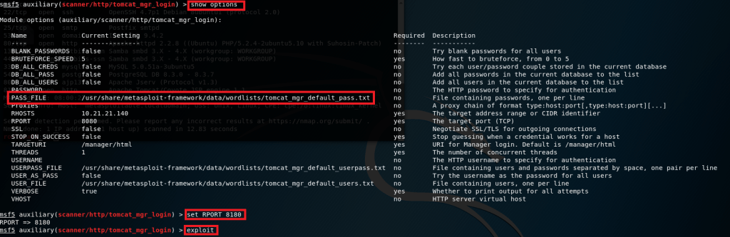 2- RHOST ve RPORT bilgilerimizi giriyoruz. RPORT’u, tomcat çalışan 8180 portu olarak belirliyoruz. Msfconsole, bizim için tomcat servisinde olabilecek şifre wordlistini kullanıyor. İstersek buraya kendi wordlistimizi ekleyebiliriz. Ama bu makine için bize msfconsole’un kendi wordlisti yeterli. Sonrasında exploit ediyoruz.