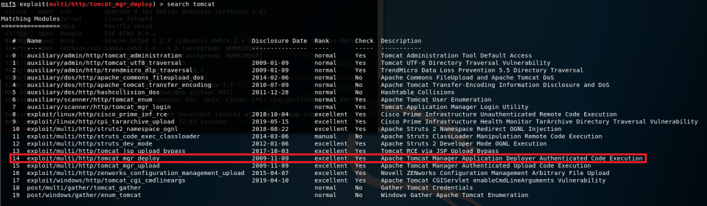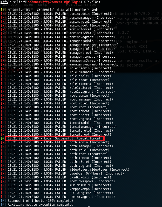 1 – 8180 portunda, http servisinde çalışan Tomcat için msfconsole üzerinden zafiyet arayalım. http üzerinden tomcat ile bağlantı kurabilmemiz için bize şifre gerekiyor. Seçtiğimiz Auxiliary modülü ile http servisine bir kabakuvvet saldırısı yapacağız.