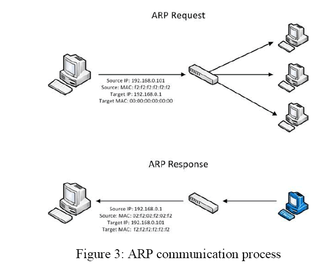 ARP(Address Resolution Protocol) : Adres Çözümleme Protokolü demektir. Yerel ağda IP adresini bildiği cihazın MAC adresini bulmak için kullanılır. Ağda olan bilgisayarlar birbirleri ile MAC adresleri üzerinden iletişim kurarlar. IP’sini bildiği bir bilgisayara bir paket göndereceği zaman, kaynak(Source) cihaz ARP tablosuna bakar ve hedef(Destination) cihazın MAC adresinin ARP tablosunda olup olmadığını kontrol eder. Eğer ARP tablosunda, hedef cihazın MAC adresi bulunmuyorsa, ARP protokolü çalışır ve IP’sini bildiği cihazın MAC adresini öğrenmek için bulunduğu ağa bir ARP Request(İstek) paketi gönderir. ARP Request paketinin içinde, MAC adresini öğrenmek istediği cihazın IP adresi bulunur. ARP Request’i ağdaki tüm cihazlar alır, IP’nin kendisine ait olmadığını anlayan cihazlar ARP Request paketlerini siler. IP adresinin kendisine ait olduğunu anlayan cihaz, Request paketini alır açar ve MAC Adresi bilgisini, ARP Reply(Cevap) paketi ile kaynak cihaza gönderir.
