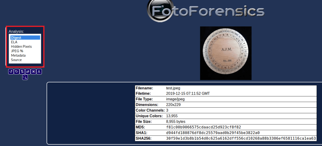 ✓ http://www.29a.ch/photo-forensics | Forensically Web Sitesi : Online olarak siteye upload ettiğimiz resim dosyası üzerinde, sağ menüde bulunan farklı seçenekler ile türlü analizler yapılabilir. Resim dosyasının arka planına saklanmış harfler, şekiller görüntülenebilir.