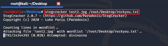 ✓ Stegcracker : Ses veya görüntü dosyalarının içine veri gizlenirken bir şifre girilir. Dolayısıyla dosyanın içine gömülen veri dışarı çıkartılacakken de bir şifre gerekiyor. Gömülü olan veriyi dışarı çıkartmak istiyorsak fakat şifreyi bilmiyorsak, “stegcracker” tool’u ile veri gömülü olan dosyaya bruteforce saldırısı gerçekleştirebilir, şifreyi bulabilirsek veriyi dışarı çıkartabiliriz.