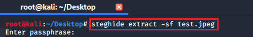 ✓ Steghide : Ses ve görüntü dosyalarının içine veri gömebileyi sağlayan tool’dur. Aynı zamanda, aşağıda ki ekran görüntüsünde ki gibi kullanıldığında (eğer şifreyi biliyorsak) gömülmüş olan veriyi dışarı çıkartabiliriz.