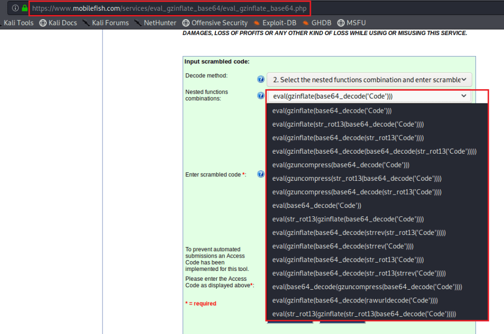 ✓ MobileFish Web Sitesi : Ekran görüntüsünde belirtilmiş olan URL üzerinde, sürekli iç içe encode edilmiş olan scripti, seçtiğimiz şifreleme yöntemlerine göre decode işlemlerini yaptırabildiğimiz web sitesidir. Bu sitede sevdiğim özellik ise, direkt yazılmış olan örneğin bir .php dosyasını buraya upload ederek, php dosyasında ki script nasıl encode edilmiş ise o fonksiyonu seçerek direkt olarak o php dosyasının decode işlemini yaptırabiliyor olabilmemizdir.