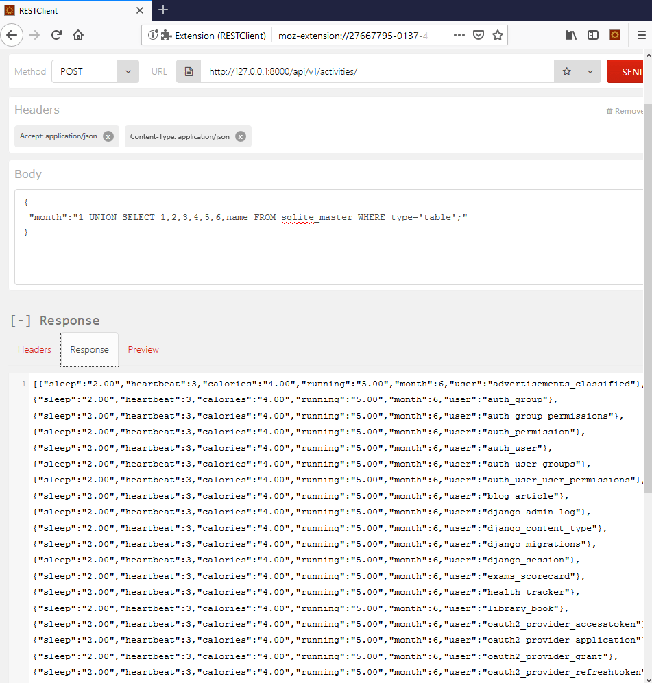 Açıklama : Bu zafiyette bizden Veritabanında bulunan tablo isimlerini bulmamız isteniyor ve bu veritabanın SQLite olduğu bilgisi veriliyor. İlk olarak bize verilen örnekteki gibi bir veri(“month”:”1″) gönderdik ve dönen cevabı inceledik. Dönen cevaptaki değişkenleri(“sleep”,”heartbeat”,”calories”,”running”,”month”,”user”) incelediğimizde bu veritabanında 6 veya 6’dan fazla Sütun olduğunu anlayabiliyoruz. Tablo isimlerini çekebilmek için bir UNION sorgusu kullanacağız. Bir UNION sorgusu yapabilmek için; Veritabanında kaç tane Sütun bulunduğunu bilmemiz ve sorguda bu değeri belirtmemiz gerekiyor. Bu adımda “month”:”1 UNION SELECT 1,2,3,4,5,6,name FROM sqlite_master WHERE type=’table’;” payloadını yazarak isteğimizi gönderdik. Dönen cevabı incelediğimizde veritabanında bulunan tablo isimlerini görüntüleyebilmiş olduk.