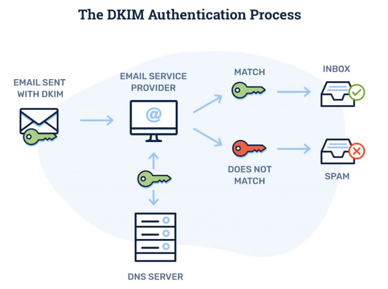• Maili alacak olan kişinin Gateway sunucusu, bizim DNS sunucumuza gelip TXT kaydı olarak eklenmiş “Public DKIM” değerine bakıp içeriğinde ki Key’i alır ve almış olduğu mailde ki “Private DKIM” ile karşılaştırır. Eğer iki değer eşleşirse mail’i doğrular ve maili alıcısına iletecek şekilde kabul eder.