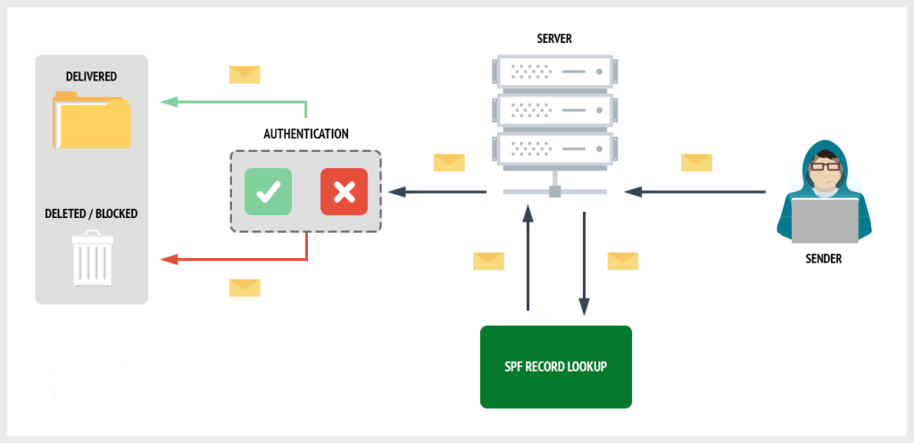 Mail Gateway sunucusu, gelen mail’in Alan Adını kontrol eder. İlgili Alan Adının yani Domain’in DNS Sunucusuna giderek SPF kayıtlarına bakar. Eğer maili gönderen IP, bakmış olduğu SPF kayıtlarında yer alıyorsa maili kabul eder ve son kullanıcısına iletir. Eğer maili gönderen IP, Gatewayin baktığı SPF kayıdında yok ise mail’i son kullanıcıya iletmez.