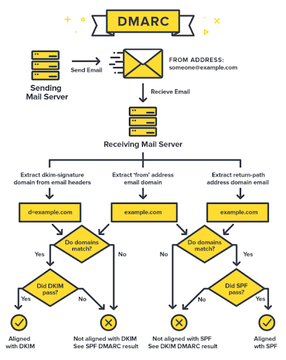 Mail Gateway sunucuları, gelen maillerin SPF ve DKIM kayıtlarının olup olmadığına, eğer var ise gönderilen Domain adı ile uyumlu olup olmadıklarını kontrol eder. Mail doğrulama başarılı olur ise DMARC Compliant(Uyumlu) eğer doğrulamalar başarız olursa DMARC Failed olarak kabul edilir.