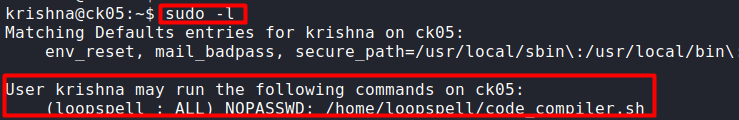 Step 18 : Çalıştırdığımız “sudo -l” komutu ile “krishna” kullanıcısının bu makinede hangi komutları çalıştırabileceğini görüntüledik. Ekran görüntüsünde de gözüktüğü üzere “krishna” kullanıcısı, “loopspell” kullanıcısı üzerinden şifre gerekmeksizin “home/loopspell/code_compile.sh” isimli bash dosyasını yetkili bir şekilde çalıştırabileceğimizi gördük.