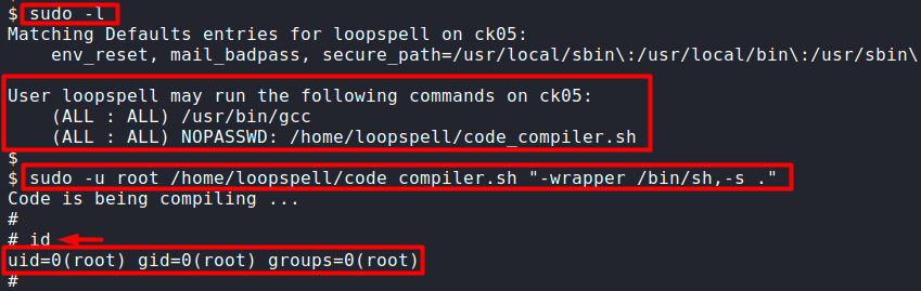Step 21 : Root haklarına sahip olabilmek için “sudo -l” komutunu tekrar çalıştırdık. Komutun çıktısından öğrendiğimiz, şifre gerekmeksizin herhangi bir kullanıcı haklarıyla /home/loopspell/code_compiler.sh dosyasını/komutunu çalıştırabildiğimiz. Bunu öğrendikten sonra çalıştırdığımız komut;