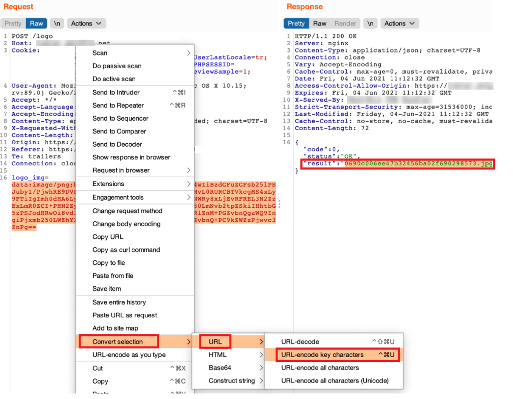 Sonrasında normal bir fotoğraf dosyası yüklenirken web sunucusuna giden isteği BurpSuite ile keserek aslında olması gereken Base64 kodunu, içerisinde XSS payloadı yazan test.png dosyasının Base64 hali ile değiştirdikten sonra HTTP isteğinin bozulmaması için aşağıdaki ekran görüntüsünde de gözüktüğü üzere Key karakterleri URL-Encode haline getirmek amacı ile değiştirdiğim kod parçacığının tamamını seçerek ” Convert Selection > URL > URL-encode key characters ” yaptım ve isteği web sunucusuna ilettim. Web sunucusunun yanıtında da gözüktüğü üzere evet dosya sorunsuz olarak bir URL’e yüklenmiş.